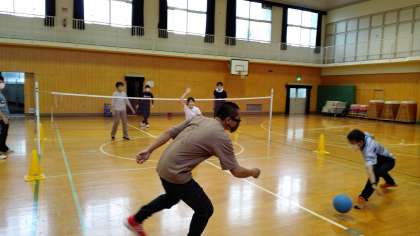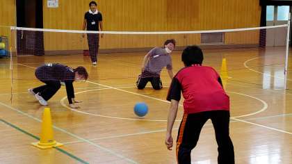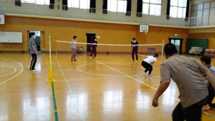 放課後、講堂で先生方か体育の研修をされています。「フロアバレーボール」の研修をされています。