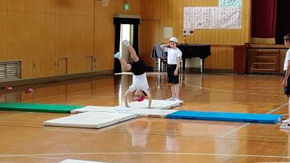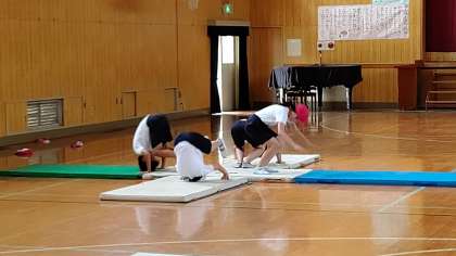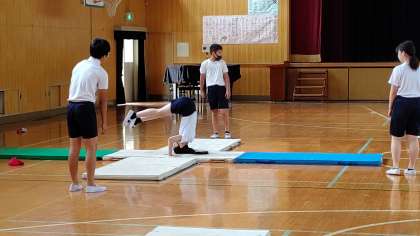 2時間目、6年生が体育の学習をしています。 グループに分かれて「マット運動」を練習しています。