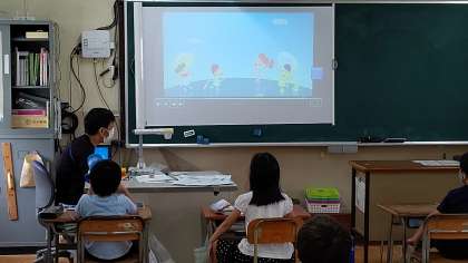 5時間目の前に、2年生が外国語活動の学習をしています。いろいろな色を英語で習っています。