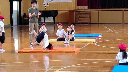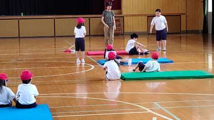 2時間目、1年生が講堂で体育の学習をしています。「前まわり」を練習しています。