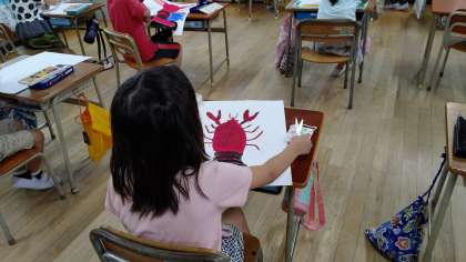 3時間目、2年生が図工の学習をしています。「ザリガニ」の絵を切り取っています。