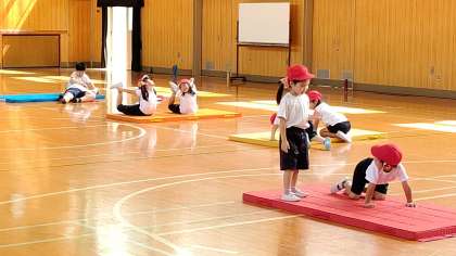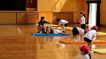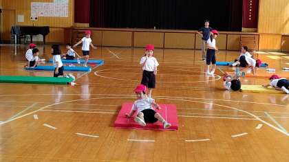 2時間目、1年生が講堂で体育の学習をしています。「歌に合わせてマット運動」をしています。