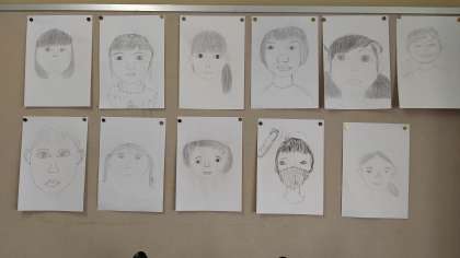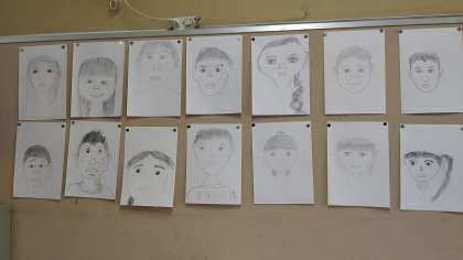 教室の後ろに、図工の時間に描いた自画像が展示されています。