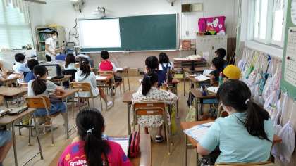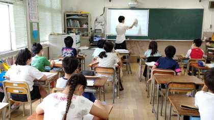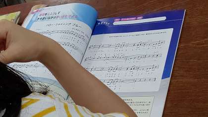 1時間目、5年生が音楽の学習をしています。「ハロー・シャイニング・ブルー」を練習しています。