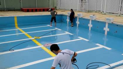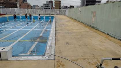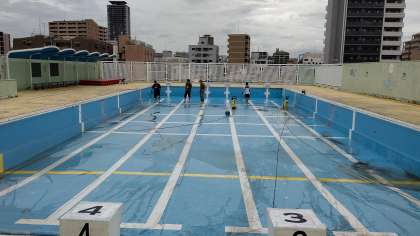午後からは、先生方と管理作業員さんがプールの底を清掃しています。