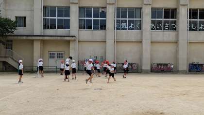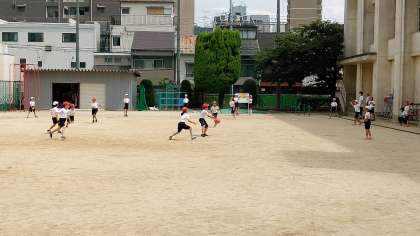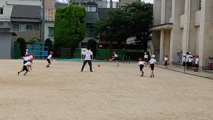 2時間目、3年生が運動場でキックベースボールをしています。