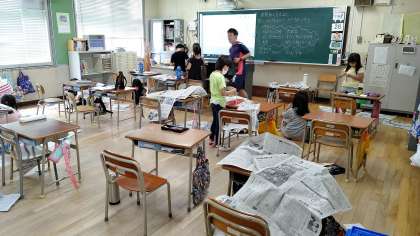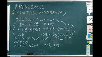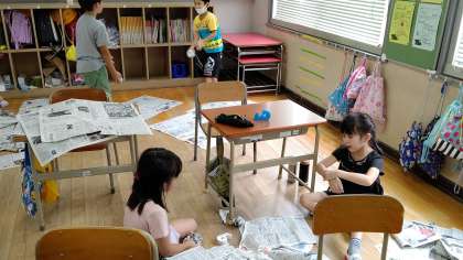 3時間目、2年生が図工の学習をしています。「新聞紙で」作品を作っています。