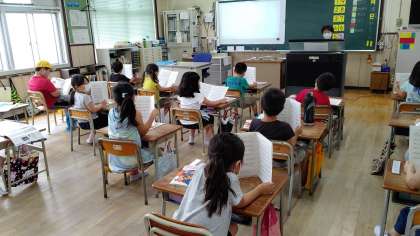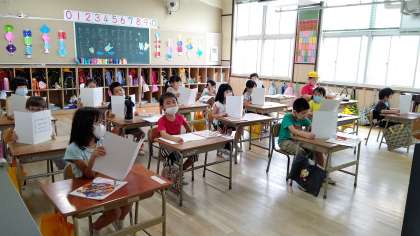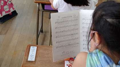 5時間目、1年生が音楽の学習をしています。「ぼくらのひこうき」を歌っています。