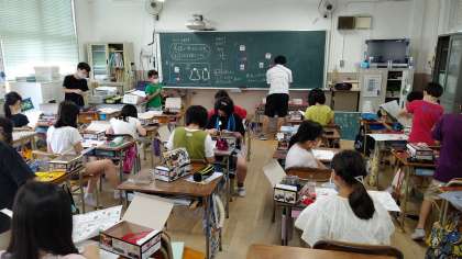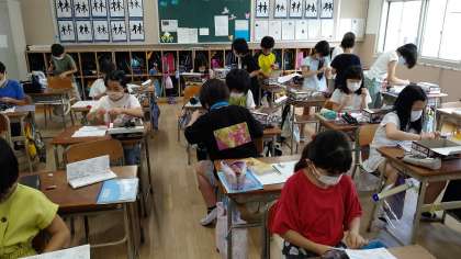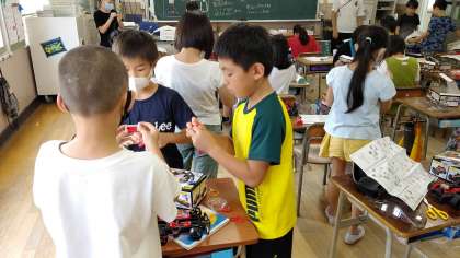 6時間目、4年生が理科の学習をしています。「モーターカー」を作っています。「電気について」学習しています。