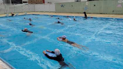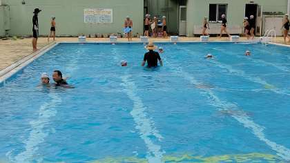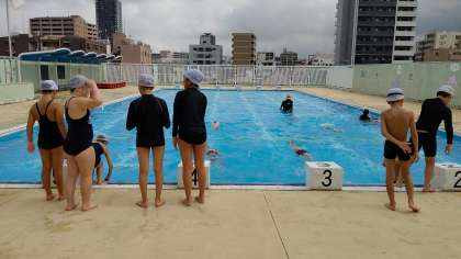 1時間目、5年生が講堂屋上のプールで水泳をしています。
