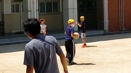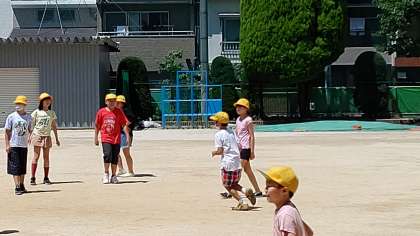 今日の昼休みは、4年生以上の児童が運動場で遊んでいます。みんな元気いっばいです。