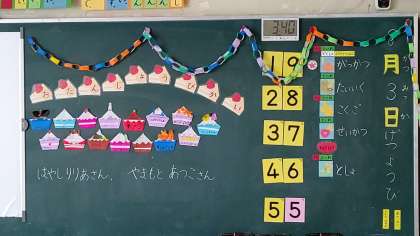 1時間目、1年生が学級活動をしています。「お誕生日会」をしています。