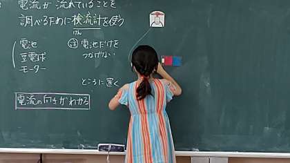 3時間目、4年生が理科の学習をしています。「電気の流れ」について学習をしています。「検流計」の使い方を学習しています。