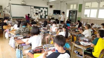 3時間目、4年生が理科の学習をしています。「モーターカー」を作って、「電気回路」を考えています。