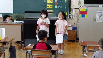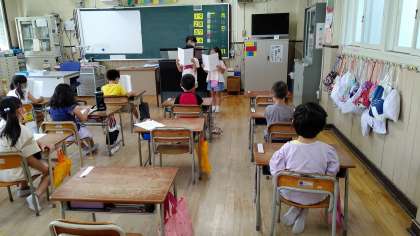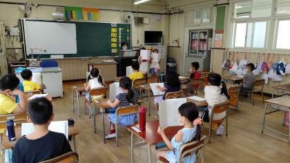 朝の学級活動で、1年生が「パプリカ」を歌っています。