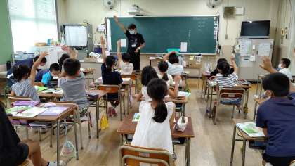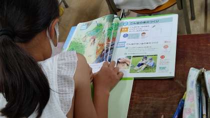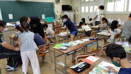 3時間目、3年生が理科の学習をしています。「昆虫」について学習しています。教科書のさし絵のなかの昆虫を見つけています。