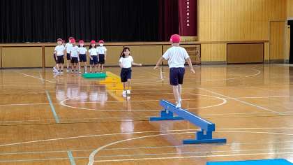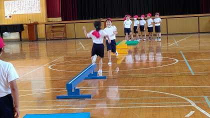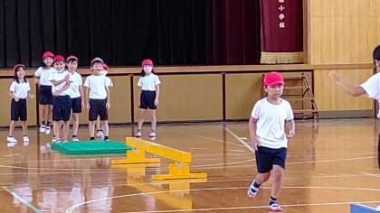 3時間目、2年生が講堂で体育の学習をしています。「マットと平均台」を使ってゲームをしています。