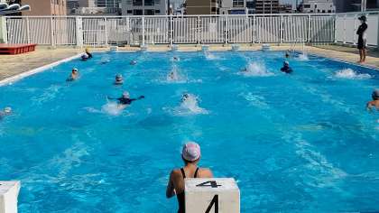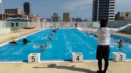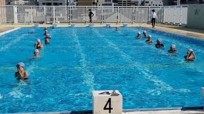 1時間目、6年生が講堂屋上のプールで水泳を学習しています。
