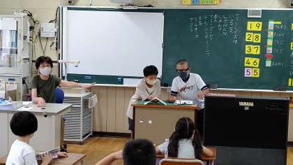 1年生が、朝の学級活動をしています。情報委員会の児童が教室に来て、昼休みにかける曲のアンケートをとっています。
