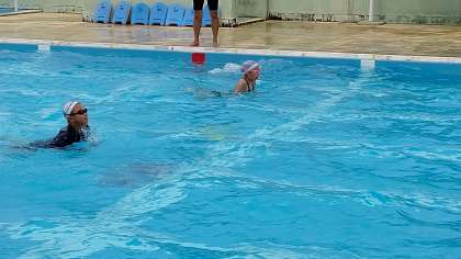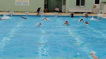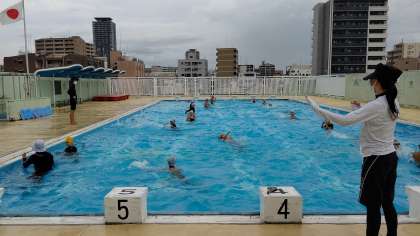 2時間目、6年生が講堂屋上のプールで水泳を学習しています。