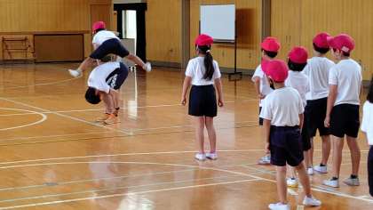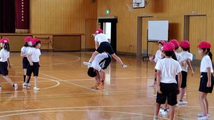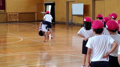 3時間目、3年生が講堂で体育の学習しています。「からだ作り運動」をしています。