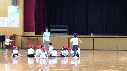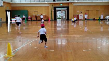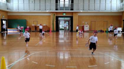 2時間目、1年生が講堂で体育の学習をしています。リレーの練習をしています。