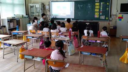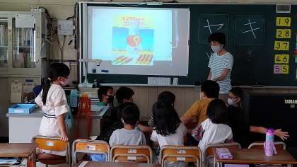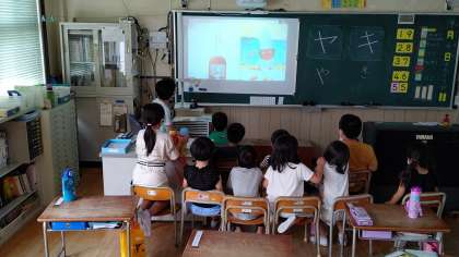 5時間目、1年生が国語の学習をしています。先生が「絵本の読み聞かせ」をしています。