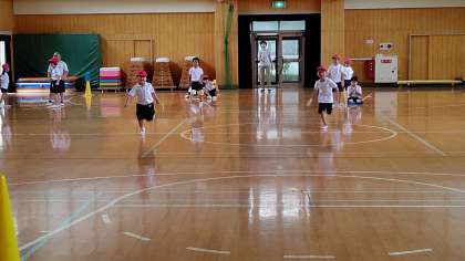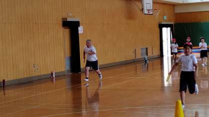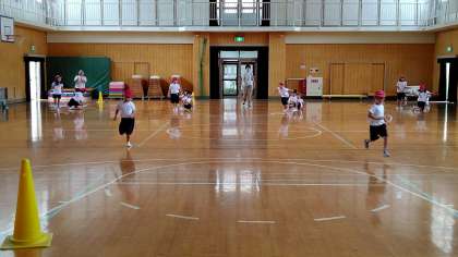 2時間目、1年生が講堂で体育の学習をしています。「リレー」の練習をしています。