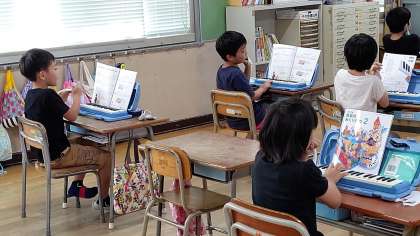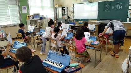 5時間目、2年生が音楽の学習をしています。「けん盤ハーモニカ」を練習しています。
