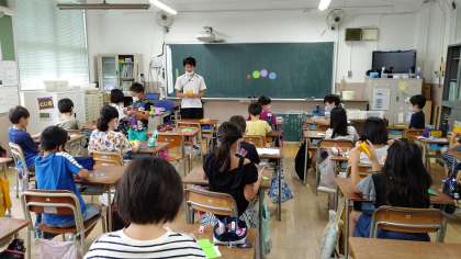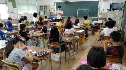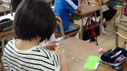 1時間目、4年生が図工の学習をしています。「コースターと栞」を折り紙で作っています。切りぬいた折り紙をラミネートして完成させます。