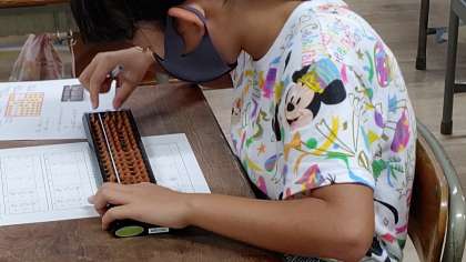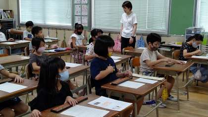 2時間目、3年生が算数の学習をしています。「そろばん」について、ゲストティーチャーの神路小学校の小島校長先生に昨日に続いて、教えていただきます。