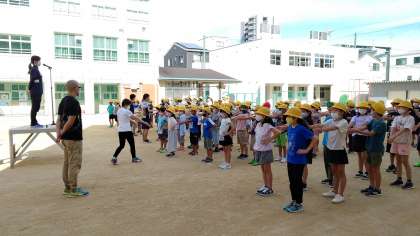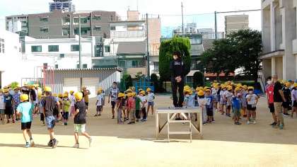 今日は、運動場で全校朝会がありました。校長先生からお話がありました。