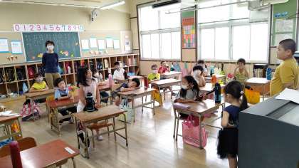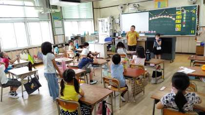 1年生が、朝の会をしています。係りの児童が、前に出てお話をしています。みんなの質問に答えています。