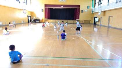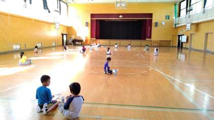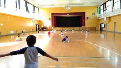 5時間目、1年生が講堂で音楽の学習をしています。「東小橋小学校校歌」を練習しています。ひとりひとり離れて大声で歌っています。