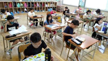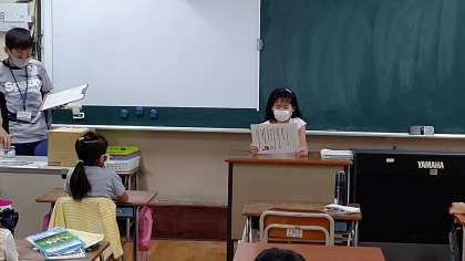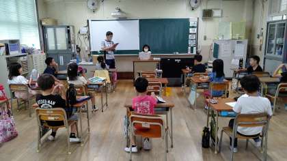 2年生が、朝の学級活動で読書活動をしています。そのあと、朝の会をしています。