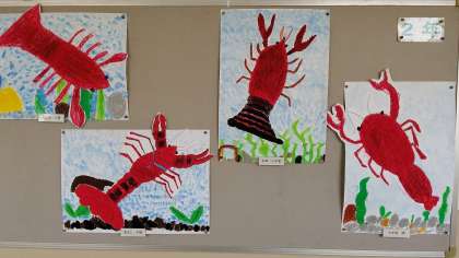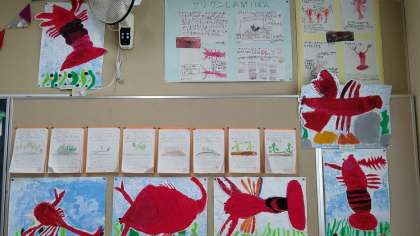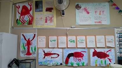 教室の後ろの掲示板、廊下の掲示板に「ザリガニ」の絵と「さつまいもの観察日記」が展示していました。