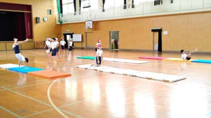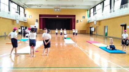 1時間目、5年生が講堂でマット運動の練習をしています。