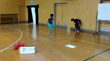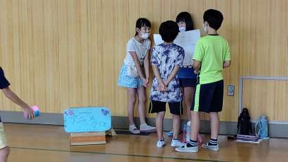 6時間目、講堂で4年生が2年生を招待して、自分たちが考えたゲームやクイズや出し物をして楽しんでいます。