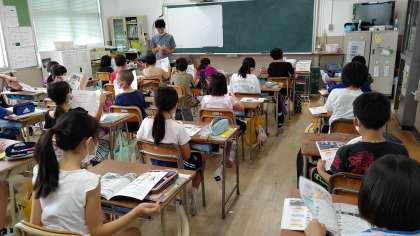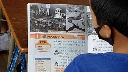 1時間目、4年生が社会科の学習をしています。自然災害を学習しています。「防災・減災」について学習しています。