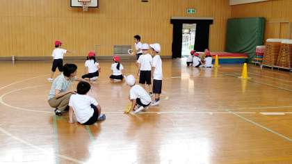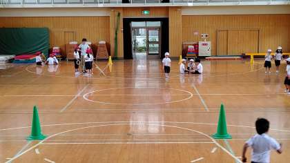 2時間目、1年生が講堂で体育の学習をしています。「リレーの作戦」を考えています。