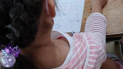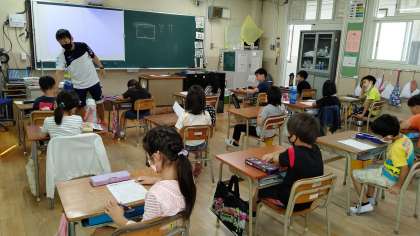 1時間目、2年生が算数の学習をしています。「三角形と四角形」のプリント問題の答え合わせをしています。