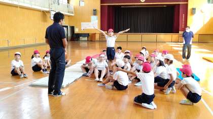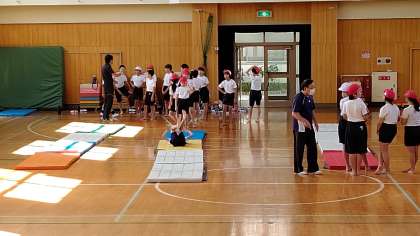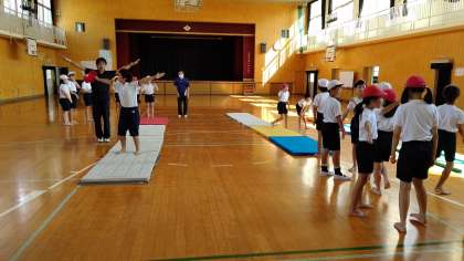 1時間目、5年生が体育の学習をしています。土曜授業「マット運動の発表会」の練習をしています。