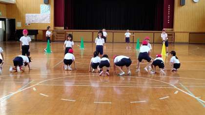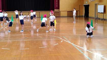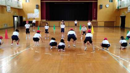 4時間目、3年生が講堂で体育の学習をしています。動物の動きを体で表現しています。