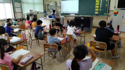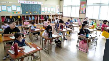 1時間目、1年生が算数の学習をしています。「算数のテスト」をしています。問題をみんなで読んでから、テストをしています。
