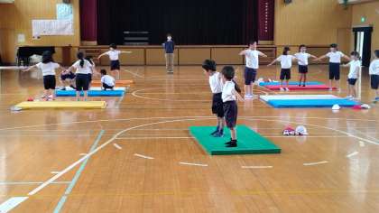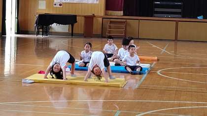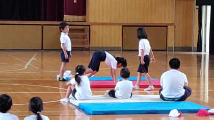 マット運動をしています。練習の成果が出てました。みんな上手にできました。