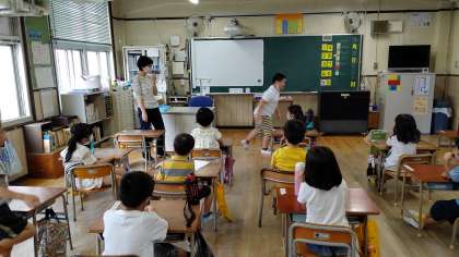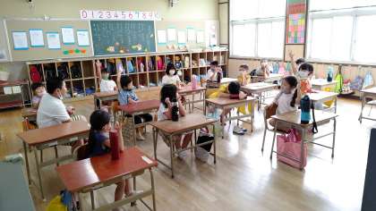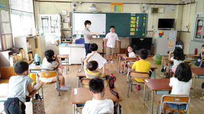1時間目、1年生が学級活動をしています。「土曜公開授業を観て、保護者の方から言われたこと」について発表しています。工夫したことをみんなに発表しています。