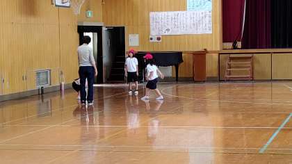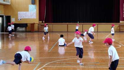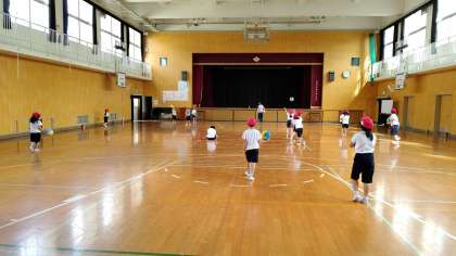 2時間目、1年生が講堂で体育の学習をしています。「高く投げたボールを受ける」練習をしています。