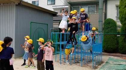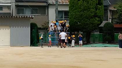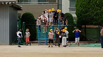 4時間目、3年生が運動場で理科の学習をしています。遮光グラスを使って「太陽の観測」をしています。