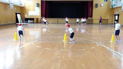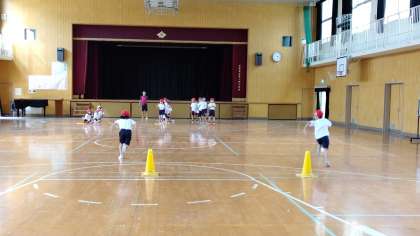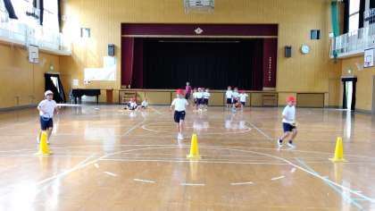 5時間目、2年生が講堂で体育の学習をしています。「リレー」の練習をしています。