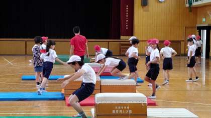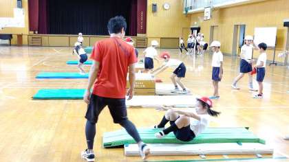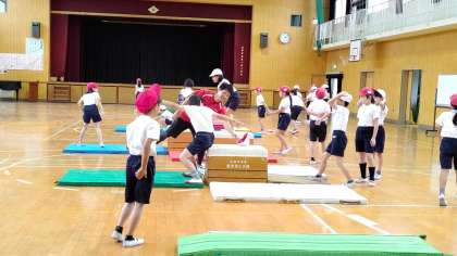 6時間目、4年生が講堂で体育の学習をしています。「跳び箱」の練習をしています。台上前転を練習しています。
